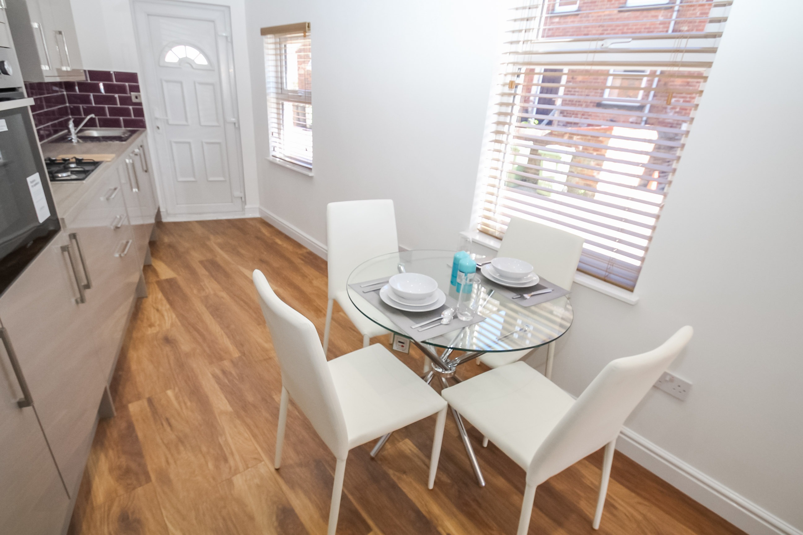 Modern fitted Kitchen with black gloss fitted units, laminate worktops, stylish tiled splash back and laminate flooring. Stainless steel sink unit over looking back yard, appliances include an integrated electric oven, gas hobs with extractor fan, integrated washer/dryer and large Fridge/Freezer. The room is also furnished with a breakfast bar and 5 stools.