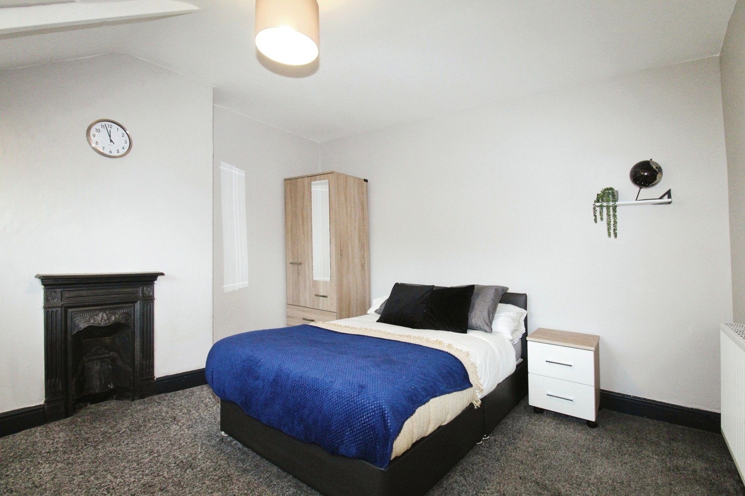 Double bedroom compromising double bed, desk, chair, wardrobe and chest of drawers.