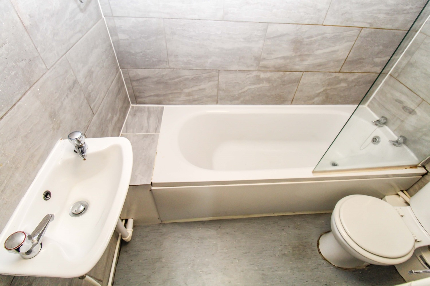 Modern bathroom compromising panelled bath with shower over, w.c and hand wash basin.