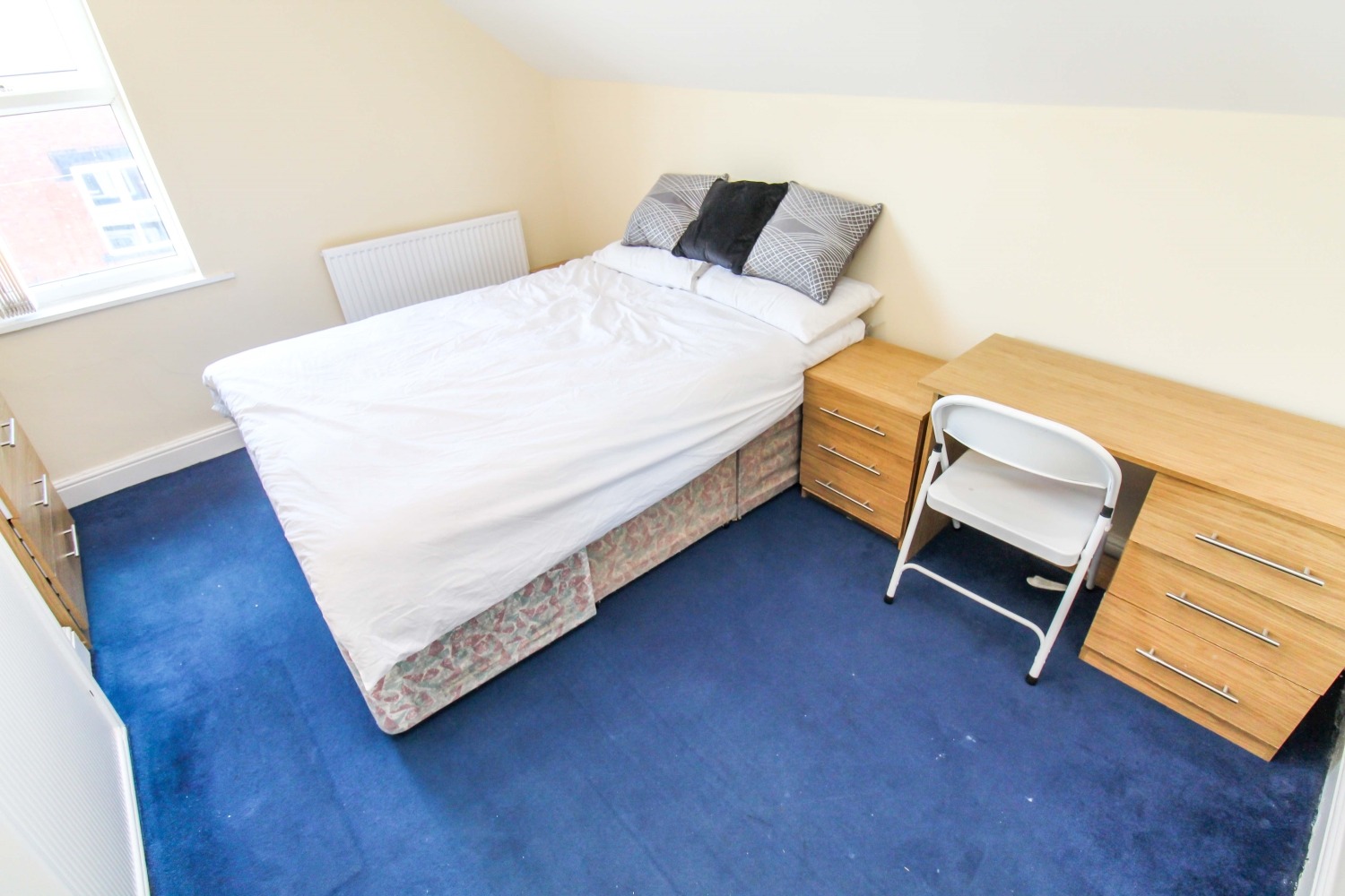 A spacious double bedroom complete with double bed and mattress, bed side table, chest of drawers, wardrobe and double glazed window providing plenty of natural light.