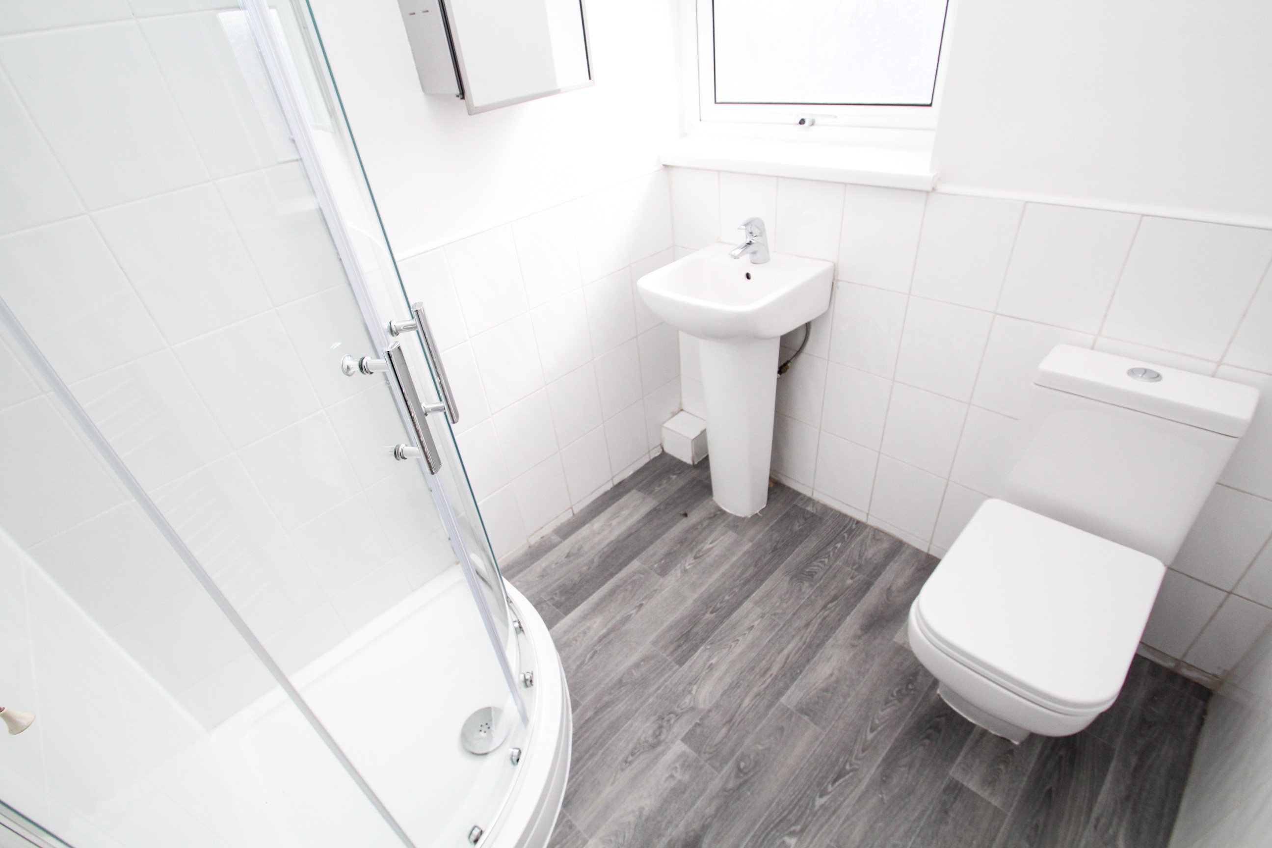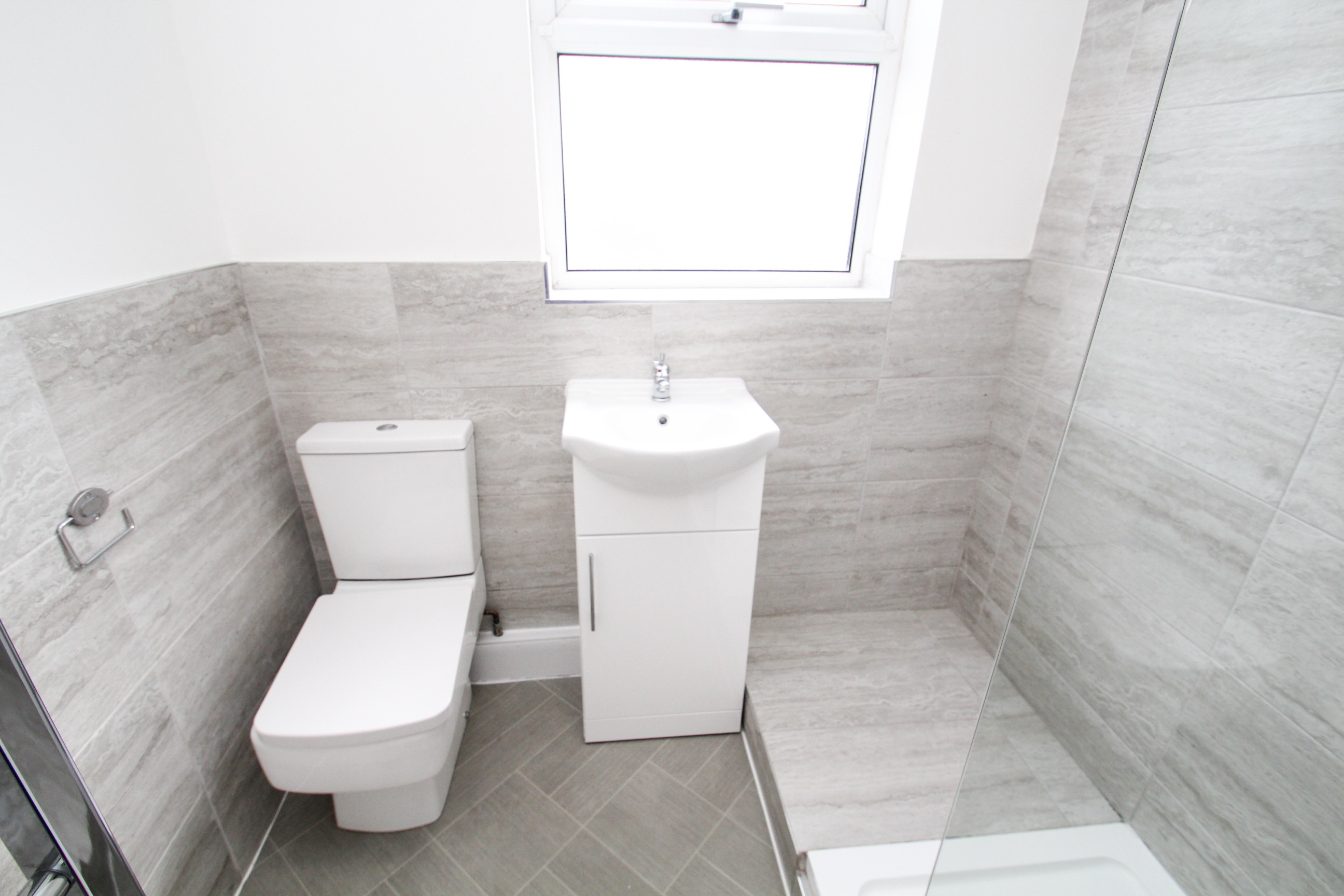 Modern fitted bathroom with walk in shower, WC and sink basin. Neutrally decorated with laminate flooring.
