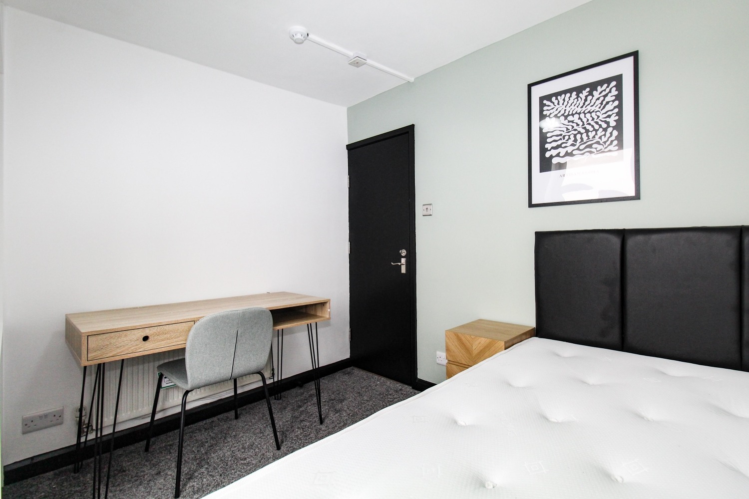 Spacious studio, furnished with double bed with storage, inbuilt wardrobe, desk and chair, kitchenette with two ring hob, sink, fridge with freezer compartment, TV, microwave. Lovely views from the first floor, secure intercom, communal doors, CCTV.