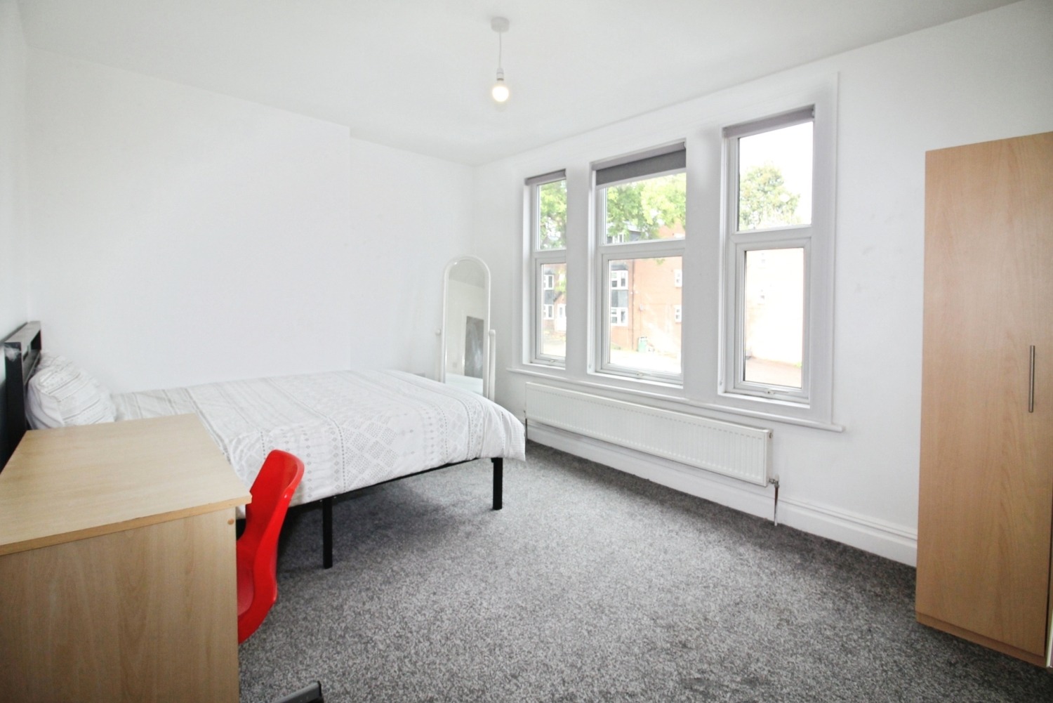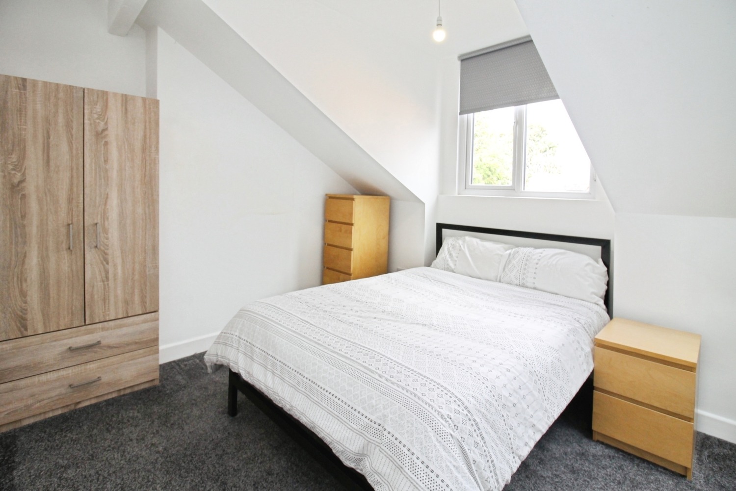 Located on the lower ground floor, a great sized double Bedroom with grey carpet flooring, neutrally decorated and furnished with a beautiful grey fabric double bed, wardrobe, chest of drawers, two bedside tables, desk and chair with a bathroom next door!