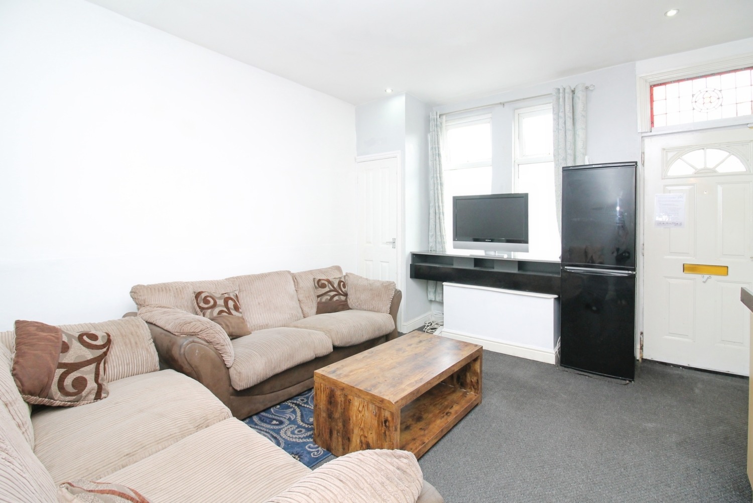 Lovely spacious living room with large window, fresh neutral decor colours and furnished.